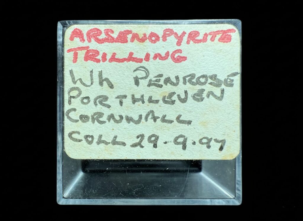 I have a number of Cornish minerals in my collection that came from Chris directly (such as the arsenopyrite trilling below), or via Bernie Day’s collection. The labels don’t have Chris’ name on them, but his handwriting is unmistakeable.
