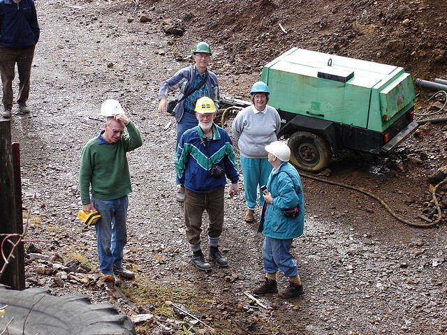 Below: Chris Jewson (centre), with Brian Davis (left), Val Hannah (bottom right), and Merv and Lil Legge behind. Outside the Adelaide Mine, Dundas, Tasmania, in 2006.
