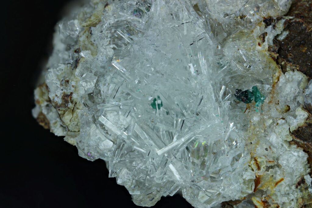 Below: Green paratacamite on prismatic natrolite and equant analcime crystals. Width of view 6mm.