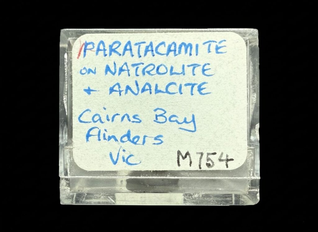 An example of this is a paratacamite with natrolite and analcime that I collected at Cairns Bay, Flinders, Victoria, a piece of which was given to the late Bernie Day. When Bernie passed, I acquired some of his minerals, including this particular one.